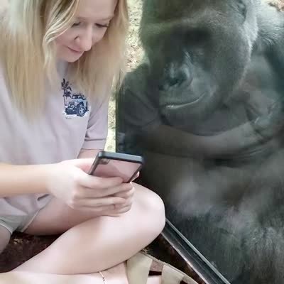 A woman shows a gorilla photos and videos on her phone through the glass enclosure at a zoo. The gorilla shakes its head and looks at her then back to her phone.