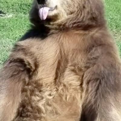 A man tells a bear to "say cheese," and the bear appears to smile.