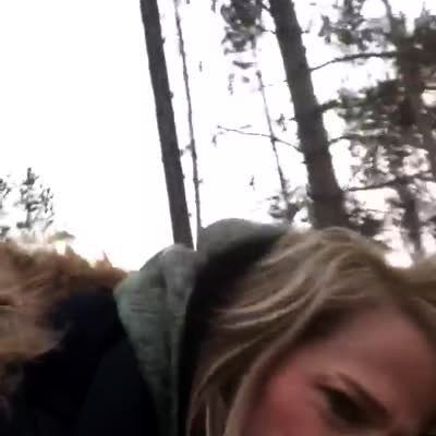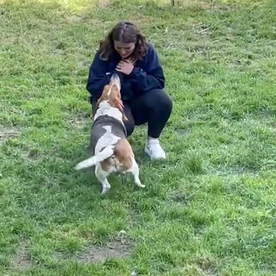 A dog runs down the stairs quickly and barks. He runs outside to a young woman who is home from college. He wags his tail and howls. Graphics. TikTok
