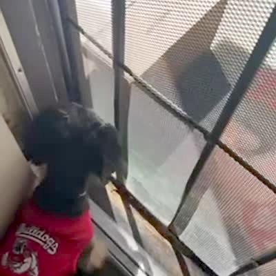 A squirrel jumps onto a window outside of a house. Then a woman gasps while it bites and tears a huge hole in her window screen.