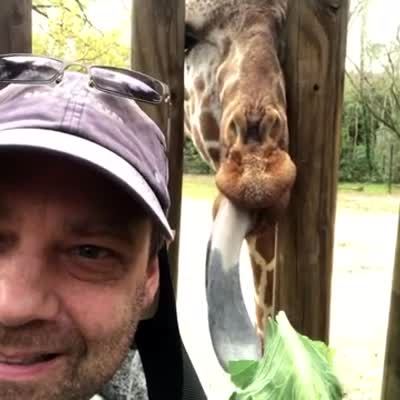 A man feeds a giraffe lettuce at a zoo, but it takes the mask hanging from his ear and eats it.