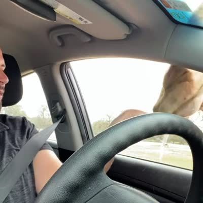 A man tries to feed a camel at a drive-through safari when an ostrich pushes it aside and sticks its long neck inside the open window of the car. The man holding a cup of food pellets is startled and screams.