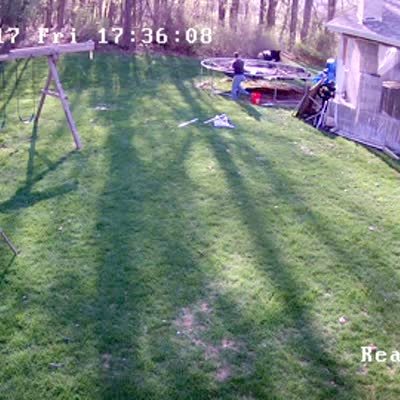 An ostrich runs through a backyard. As it passes the home owner drops a cleaning rag in disbelief. Security footage.