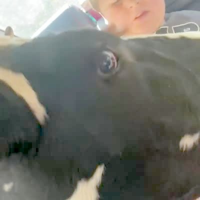 At a drive-thru zoo, a hungry cow sticks her head inside a car and helps herself to a cup of food as a tot boy and tot girl in the backseat cry.