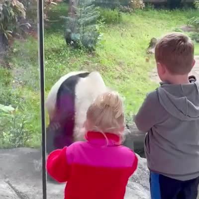 A tot girl stands behind a window at a zoo when the Panda Bear wipes his backside up against the pane.