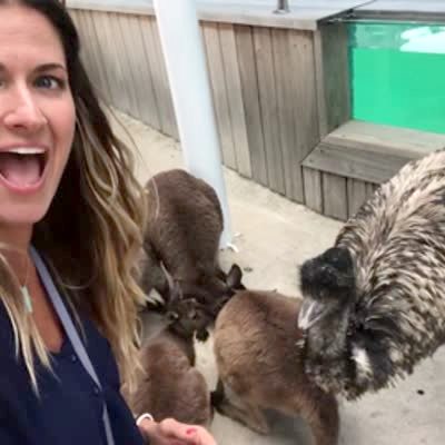 A woman screams at a zoo when an emu takes a bag of food out of her purse.