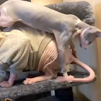 A Sphynx kitten cat watches an adult Sphynx cat's tail while they are on a cat tree in a living room, then she climbs on him and plays with his tail. They fall off of the cat tree together.