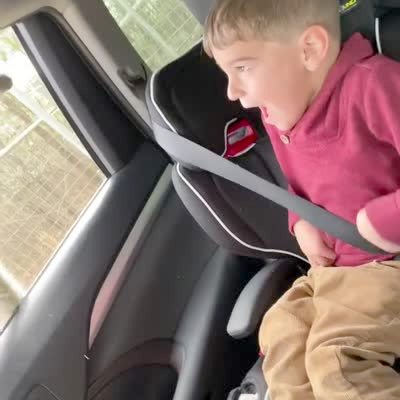 A camel sticks its head into the car at a drive through safari and makes a young boy scream, then it bites the young boy's butt.