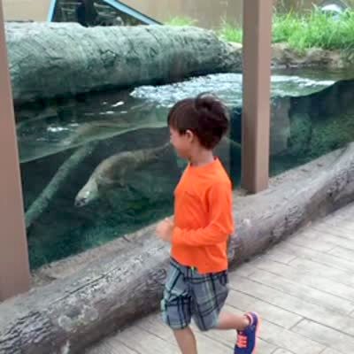 When a polar bear at the zoo jumps towards the glass, a young boy on the other side of the glass gets scared and falls. Featured talent cleared (the two boys standing in front of the glass).