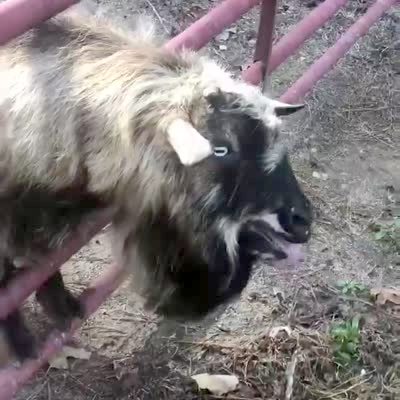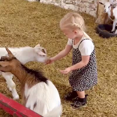 A young girl pets goats at a petting zoo and one of them farts and she recoils.