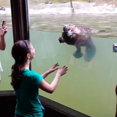 A young boy at the zoo hits the glass at the bear exhibit. The bear jumps at the glass towards the boy and all the adults gasp.