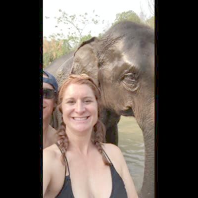 A man and woman smile for a selfie picture with an elephant and the elephant turns his head and knocks the man down.