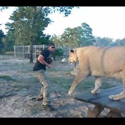 A man fake boxes a female lion at a nature preserve as it stands on a picnic table. The lion jumps on him and knocks him down to the ground.