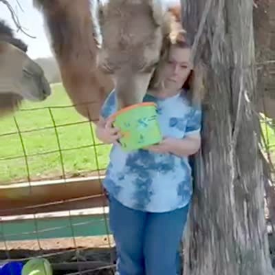 A woman feeds three camels at a safari park and they swarm her and one of the steals the bucket of food.
