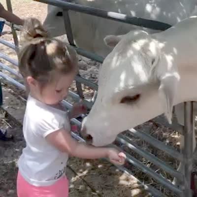 A tot girl feeds a cow at a petting zoo, but the cows head butts her and the girl falls over.