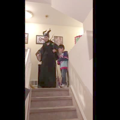 A woman wears a "Maleficent" Halloween costume, and walks down the staircase of her home. Her young son stands at the top of the stairs, and says goodbye to her. She walks down, but trips and falls on her face at the bottom of the stairs.