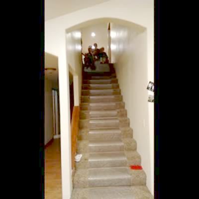 A young girl tells her mother not to fall while the woman walks backwards down the stairs with her, and the woman says that she will not fall. The woman trips and falls backwards proving her daughter correct.