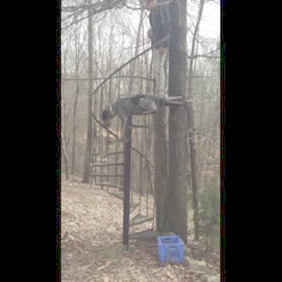 A young man and a dog climb up a spiral staircase to a tree house. The staircase falls and the man and the dog crash down to the ground.