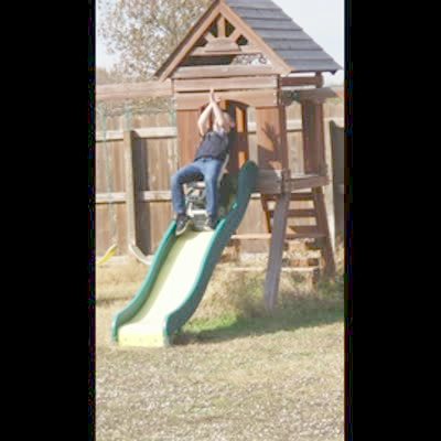 A boy rides a toy truck down a slide in the yard and falls backwards off of it halfway down the slide.