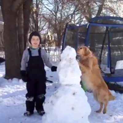 A boy stands beside his snowman outdoors and starts to say that he's going to Karate chop it when his dog stands against the snowman and knocks it over first.