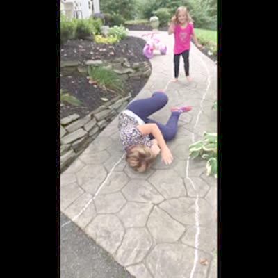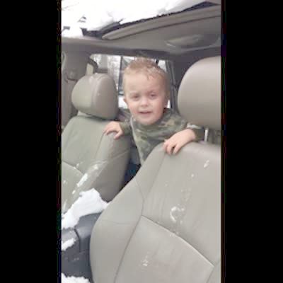 A young boy climbs into the back of a power wheels car and falls to the ground when his sister drives forward