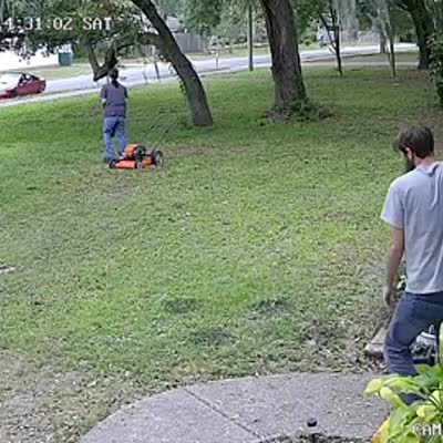 A man pushes a lawnmower through the yard and a tire rolls down the street after it comes off a car and it rolls up to him and hits the lawnmower. Security footage. Featured talent cleared only (the man pushing the lawnmower and the person who comes out of the house).