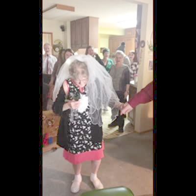 A senior woman tries to throw a bouquet of flowers as she renews her vows but she throws the flowers up in the air and they land on her head.