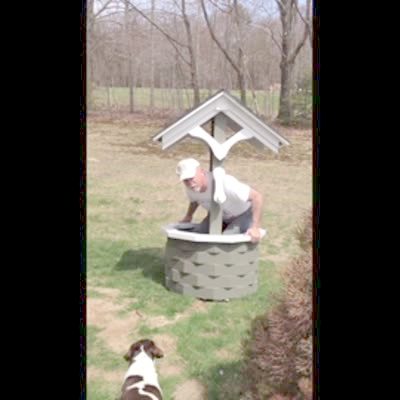 A man picks up a small well and stands in it to move it, but falls down on the ground.