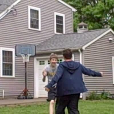 One teen boy throws a basketball to another outdoors, who rebounds it with an exercise ball, off of the roof and wall of a house and into a basketball hoop.
