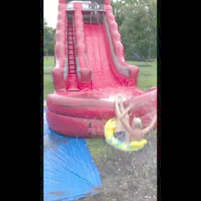 A senior woman sits at the top of a large inflatable water slide. She slides down, hits the end of the slide, and flips over on to the ground.