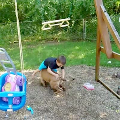 A young boy runs and flips on a jungle gym bar. A dog runs under the young boy and the boy lands on him and is dragged by the dog. Slow motion.