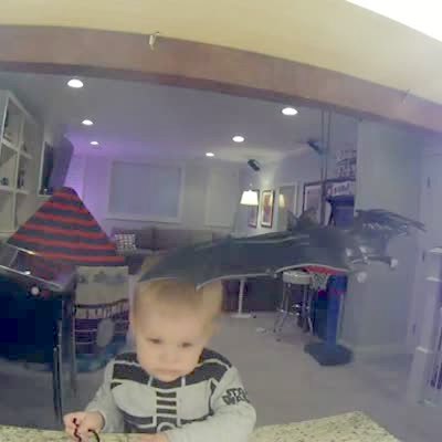 A young boy screams and cries while sitting at the kitchen counter when a Pumpkin faced Halloween mannequin falls towards him. Security footage.