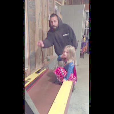 A man and a young girl play Skee-ball in the garage and the girl accidentally throws the ball to the side and hits the person with the camera.