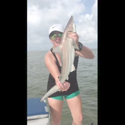 A woman holds a shark on a boat. The shark then slaps her in the face with its tail and escapes.