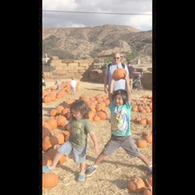 A young boy swings a pumpkin at a pumpkin patch and hits his brother in the groin. Featured talent cleared only (the two boys in the foreground and their father behind them).
