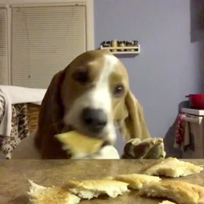 A dog stands up and bites at pieces of food on a kitchen counter top.