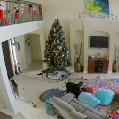 A dog gets tangled up in the lights on a Christmas tree in the living room and plays with another dog. The two dogs pull on the lights so hard that they knock ornaments off the tree and eventually knock the tree down as well.