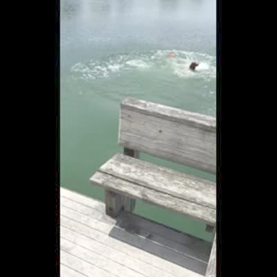 A dog runs off a pier to chase a frisbee. When the dog jumps, its hind legs go forward and the dog lands on the water on its back.