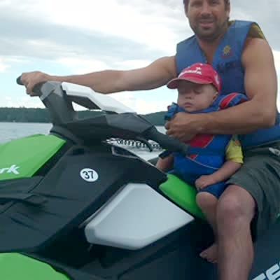 A man holds his sleeping infant son on a jet ski and rides the jet ski in circles. The jet ski tips over and they both fall into the water.