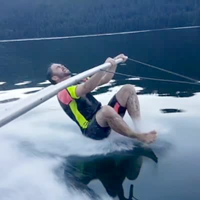 A man holds on to a pole on a boat and water skis without the ski. He then falls into the water.