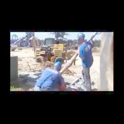 Two men try to plant a tree. One loses control and falls into the other at 0:38.
