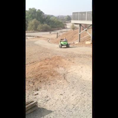 A middle age man rides around a dirt yard in a dune buggy cart. He crashes into a tree, knocking leaves off the tree. Action in first minute.