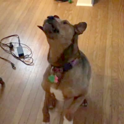 Two dogs butt heads in slow motion when their owner tosses a treat to them in the kitchen indoors. Vine/Instagram AA: dogs in super slo-mo