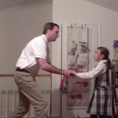 Two young girls record themselves for YouTube. One girl pulls the other down causing one of them to slam their head on the counter top. Video is replayed in slow motion. Indoors