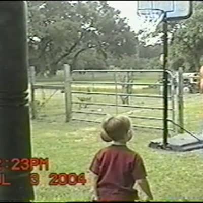 Young boy tries to throw basketball up through hoop standing underneath it. Ball hits boy in the face hard, bounces back off net fast. Game, sports. Farm, backyard.