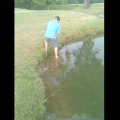 A man tries to hit a golf ball out of a lake outdoors. The man falls in when he hits the ball, amusing the man behind the camera.