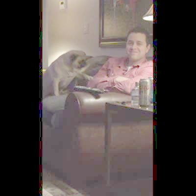 A pug dog paws at a man's arm repeatedly until he gets some attention from the man.