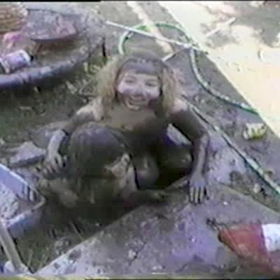 A boy and a girl lie on a trampoline outdoors as the boy holds a water hose in a balloon, filling it with water. The two kids laugh with anticipation for the balloon to pop. It finally does, amusing the man behind the camera.