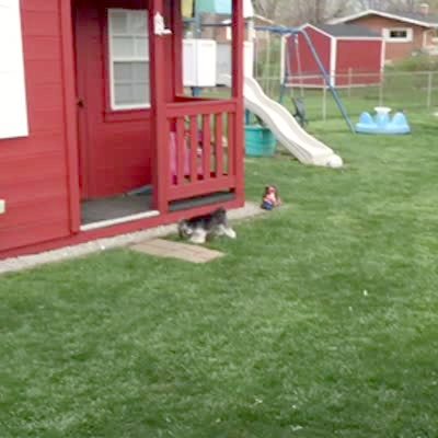 A man opens up a grill on a back porch. A squirrel runs out of the grill and away. (2103)
