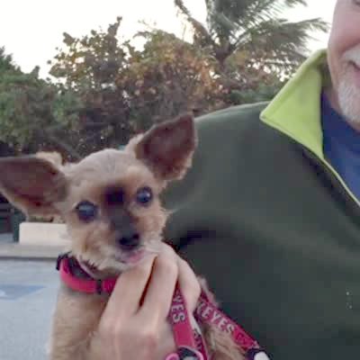 Man asks dog "Where's your girlfriend?" and dog/ black lab puts its arm around yellow lab / other dog. Pet trick